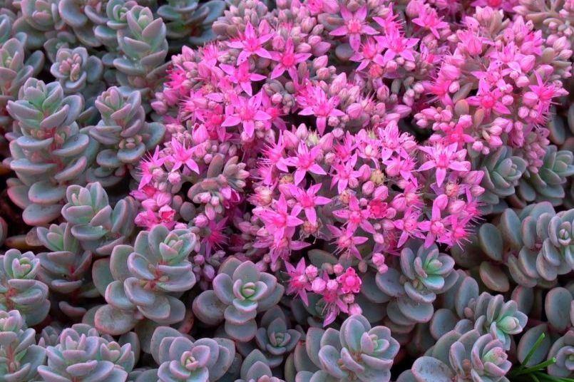 Многолетнее суккулентное растение 4—6 см высоты, с многочисленными стелющимися и укореняющимися стеблями и супротивными округлыми сочными листьями, скученными в живописные «розочки». Цветки мелкие, ярко – розовые, собраны в небольшие зонтиковидные соцветия. Разрастаясь, образует ковер. Цветет в августе.