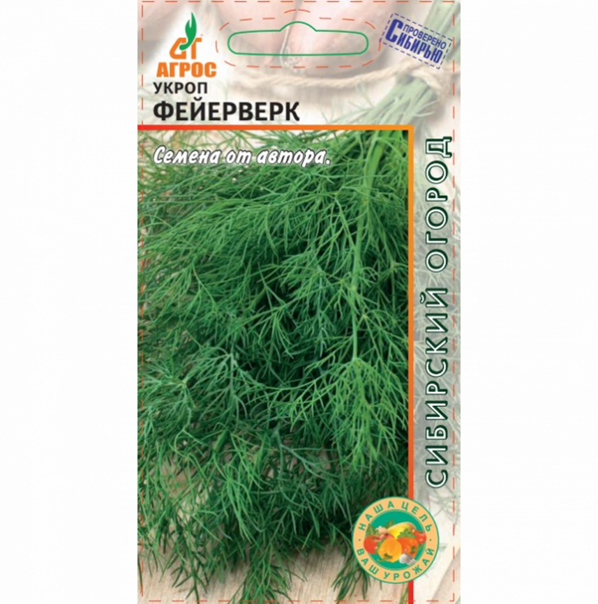 Укроп Фейерверк — среднеспелый сорт. Кустовой сорт образует 3-4 стебля из узла кущения. Период от всходов до уборки на зелень 35-45 дней, до цветения 55-60 дней, до созревания семян 110-115 дней. Розетка листьев полуприподнятая. Листья темно-зеленные, среднего размера, пышные, с прекрасным сладковато-укропным ароматом. Рекомендуется для получения пучковой продукции. Особенности выращивания: семена высевают рядками на глубину 0,5 см в несколько сроков за сезон с интервалом 20-25 дней. Посев не загущают. Необходим регулярный полив.
