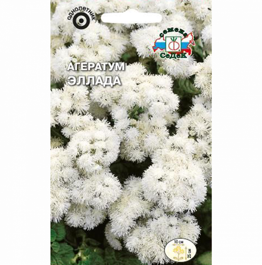 Агератум Эллада (мексиканский, белый) — белоснежные шапки этого растения особенно эффектны в «версальских» цветниках и парадных партерных зонах. Кустик компактный, сильноветвистый и хорошо облиственный. Мелкие многочисленные цветки собраны в небольшие соцветия-корзинки. Растение теплолюбиво, хорошо растет на открытых солнечных участках и легких, с умеренным плодородием почвах; отзывчиво на полив. После стрижки быстро отрастает и обильно цветет. Рекомендуется для бордюров и ковровых массивов, декорирования балконов, как горшечная культура.
