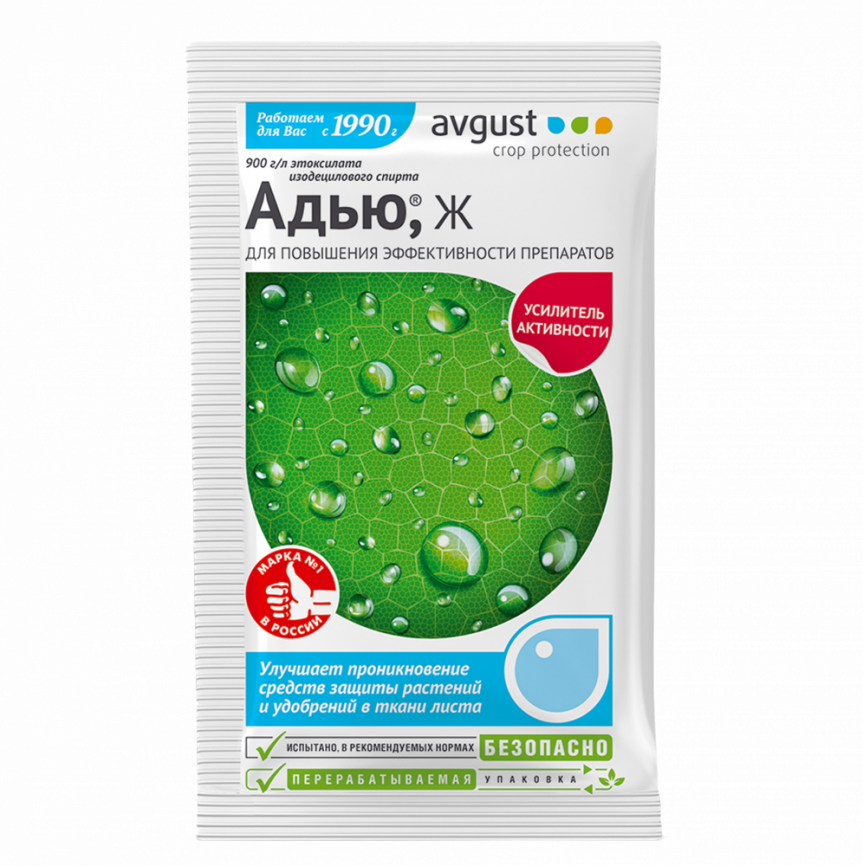 Avgust Адью – адъювант, усилитель активности гербицидов. Применяется для повышения эффективности препаратов. Препарат увеличивает проникающую способность препаратов, повышает эффективность пестицидов, способствует дождестойкости применяемых препаратов, предотвращает скатывание капель растворов с растений, листья которых густо опушены или покрыты восковым налётом.