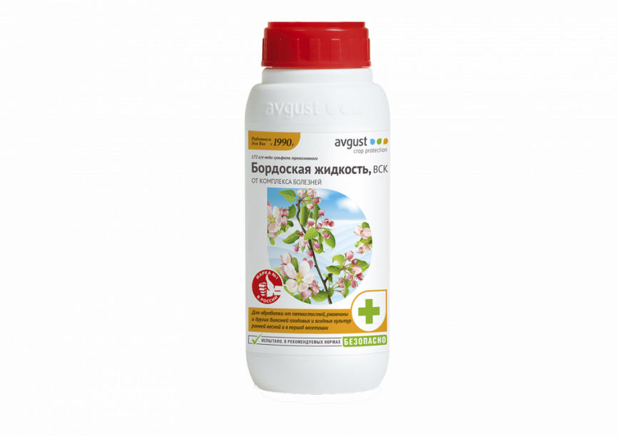 Avgust Бордоская жидкость – контактный фунгицид для защиты плодово-ягодных культур от грибных и ряда иных заболеваний. Эффективен против септориоза, парши, монилиоза, клястероспориоза, столбчатой ржавчины и других распространенных болезней. При соблюдении рекомендуемых норм она не фитотоксична, то есть не угнетает рост и жизнедеятельность садовых культур