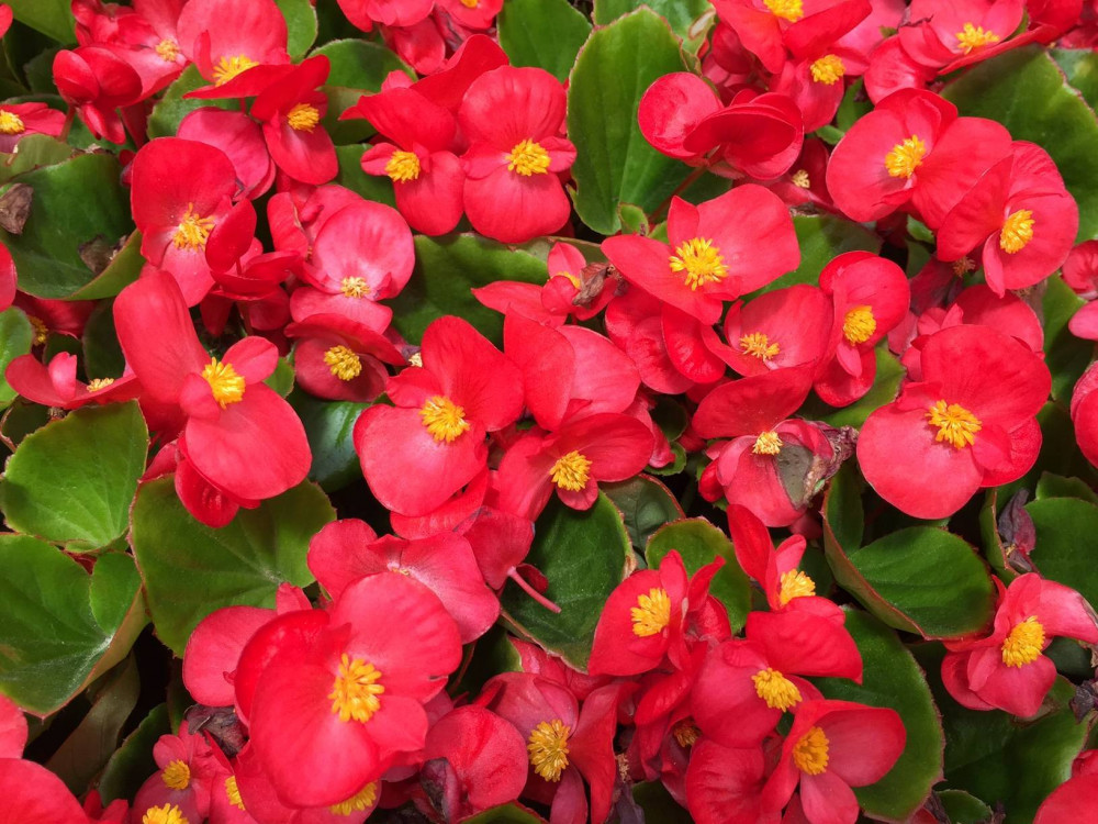 Бегония вечноцветущая — небольшое растение с мясистым гладким стеблем, который достигает в длину 40 см. Его глянцевые листья слегка неправильной формы ярко-зелёного или коричневато-красного цвета, иногда с бронзовым оттенком. Цветки некрупные, от бело-розового до красного цвета собраны в небольшие рыхлые кисточки, свисающие с побегов. Бывают как простые, так и махровые.